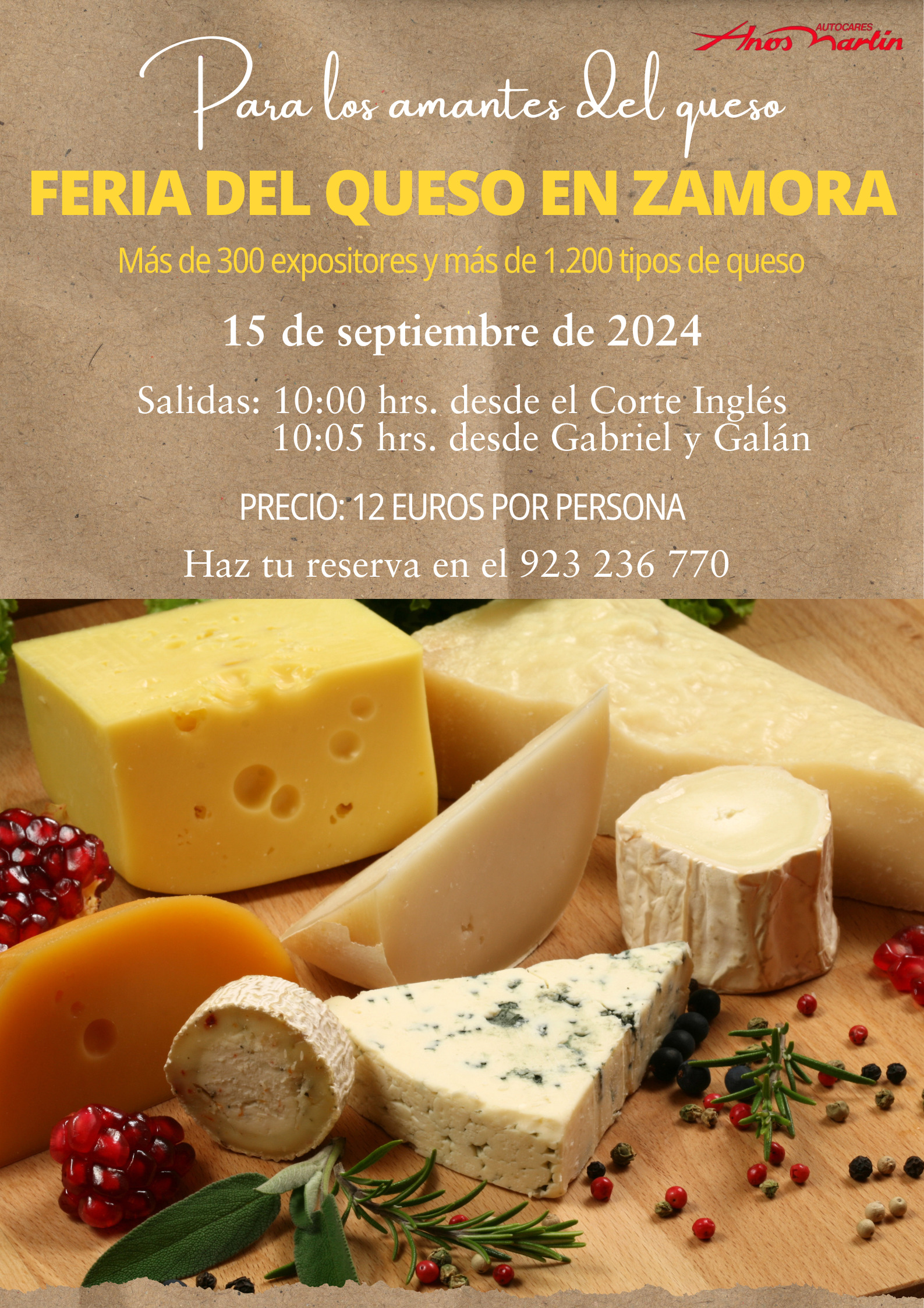 ¡Acompáñanos a pasar un día dedicado a todos los amantes del queso! Disfrutaremos enormemente con grandes degustaciones de más de 1.200 tipos de queso y exploraremos más de 300 expositores de productos típicos de Castilla y León, como mermelada, miel, dulces, vino, almendras,… La comida será libre por los diferentes stands.